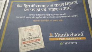 7hills Manikchand Products Private Limited publishing large eye catching advertisement on COVID19 in a newspaper